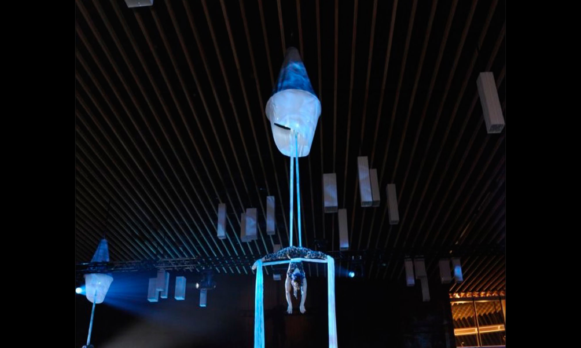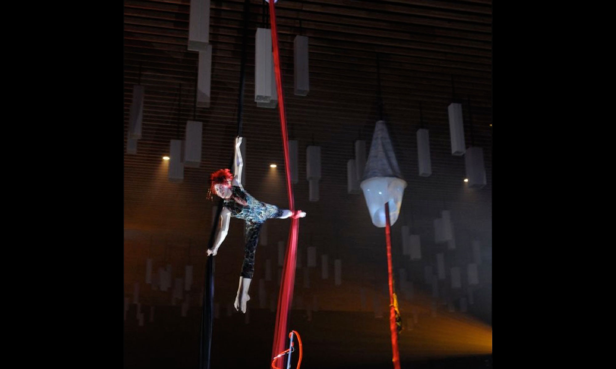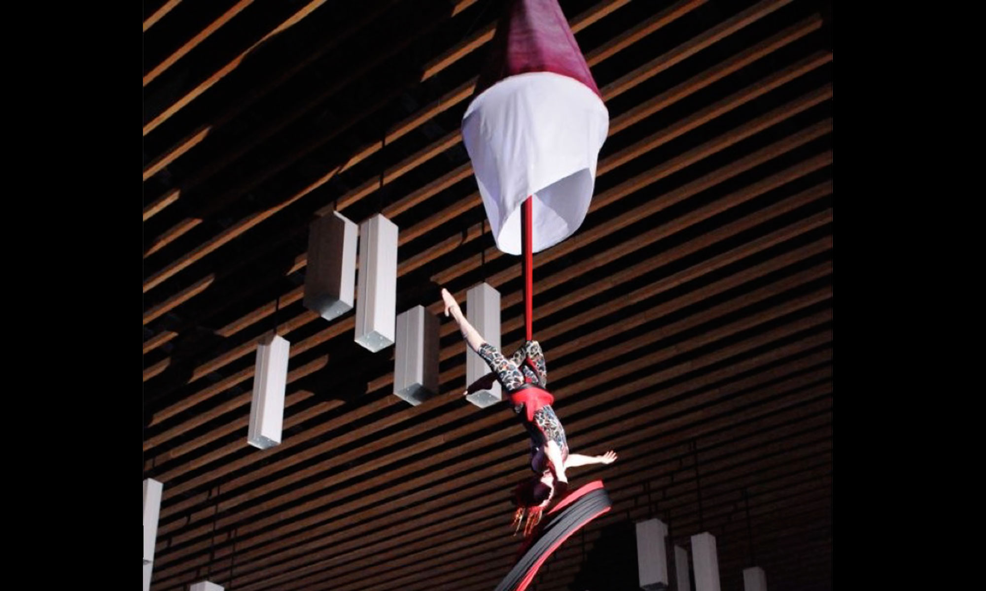 An artist can stay in the platform for up to 2 hours prior to an aerial performance, at which point they lower their fabric, and slide down to perform adding a surprise element to an already daring act.