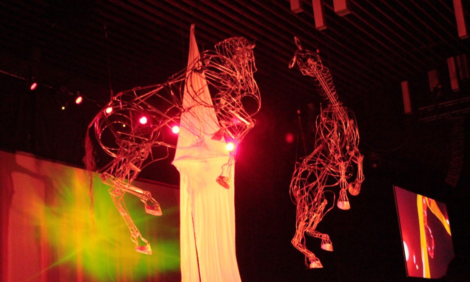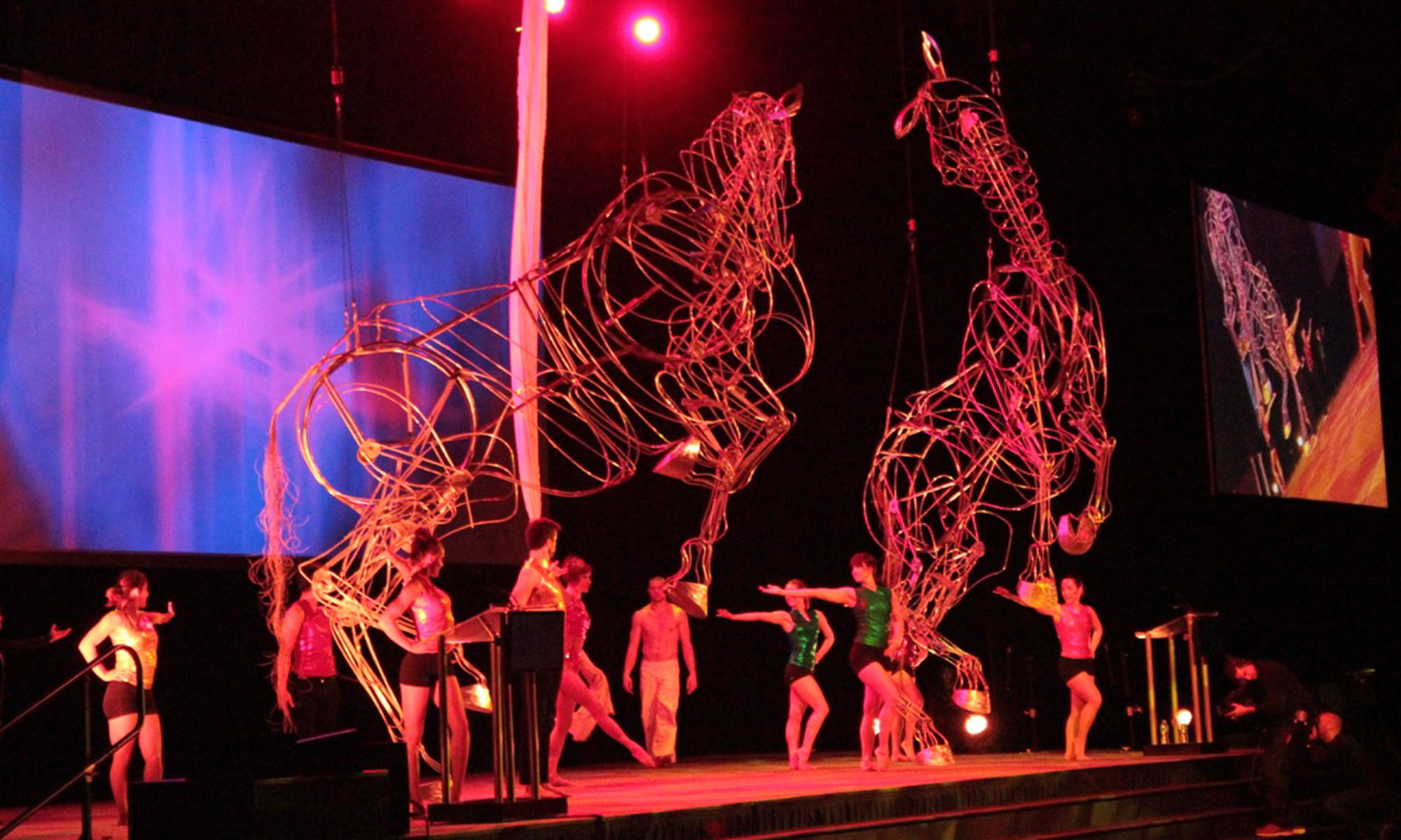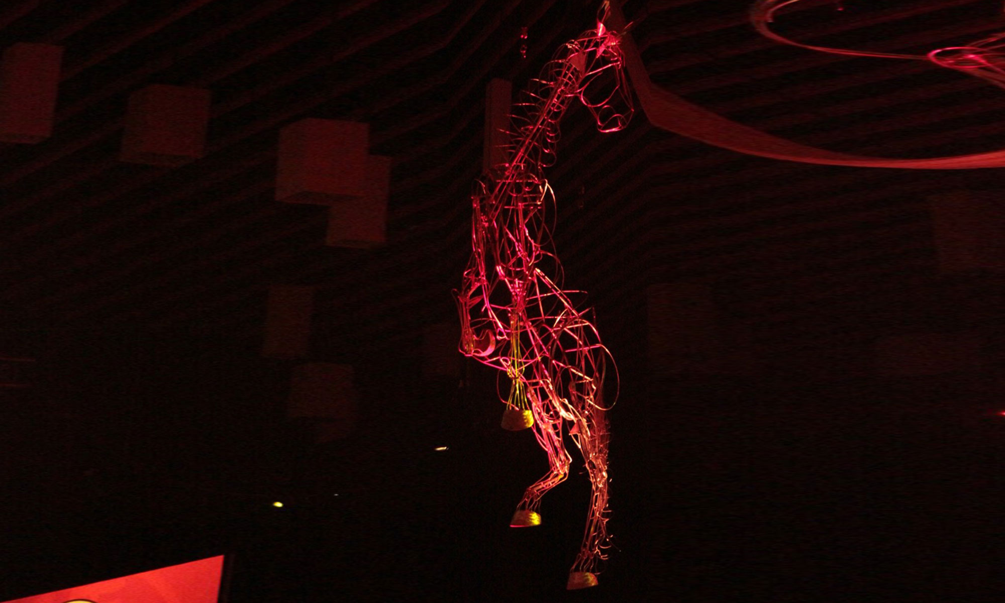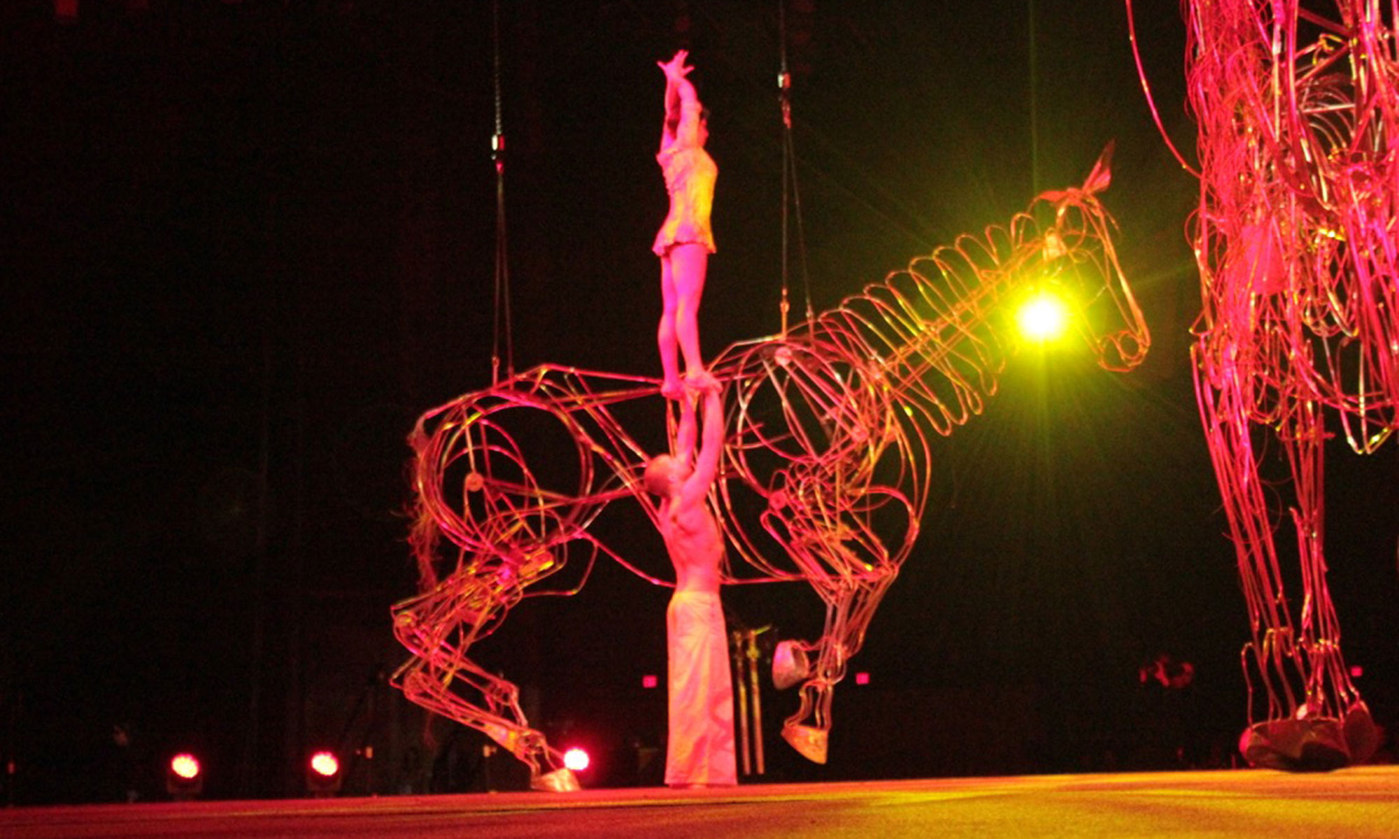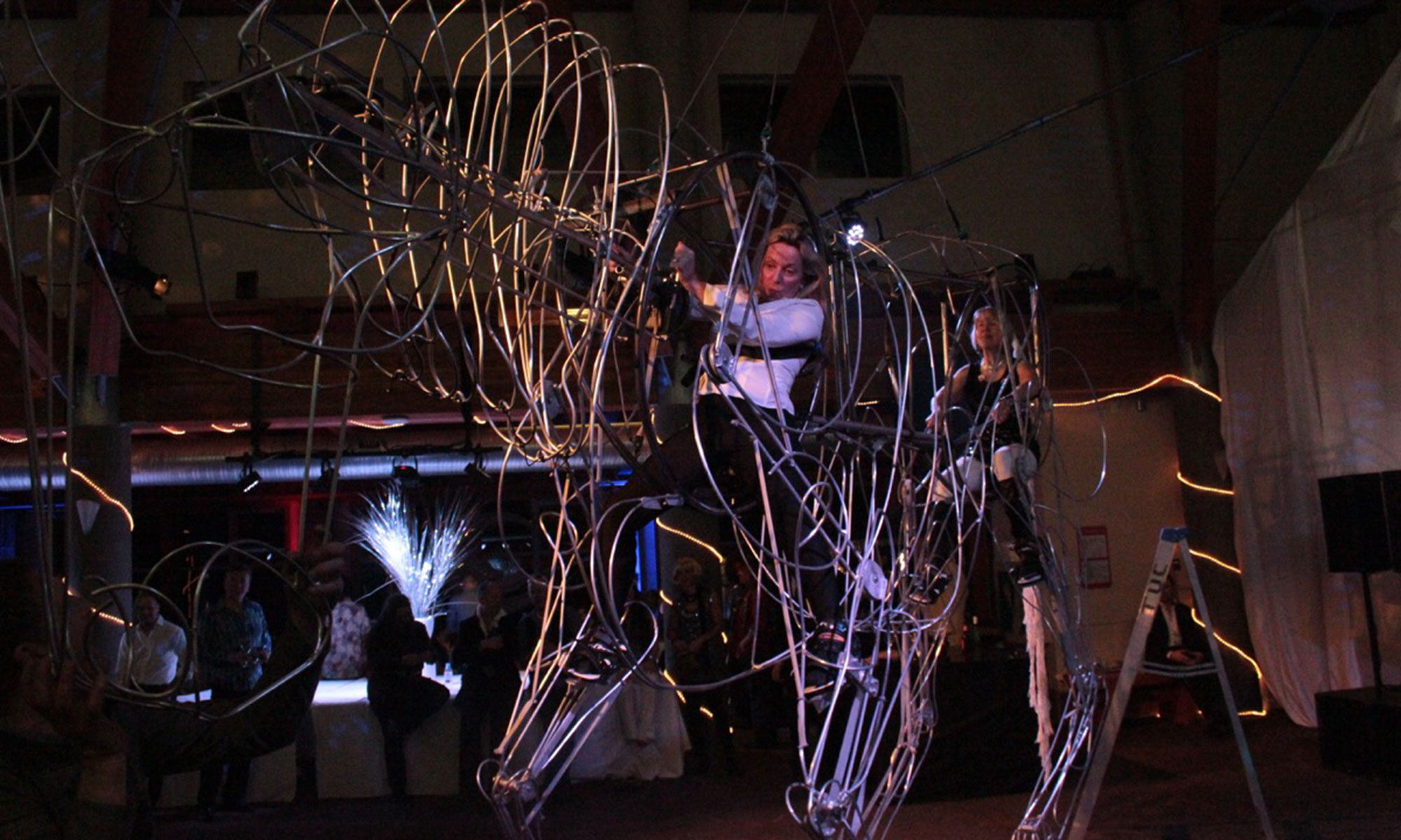 Our Chevaux are a pair of larger than life horse sculptures who’s presents in a room can’t be ignored. When piloted by circus staff these aluminum beasts come to life in a playful and life like way. Les Chevaux can also be un-manned to create sculptural ambiance either low to the ground or suspended in the air.