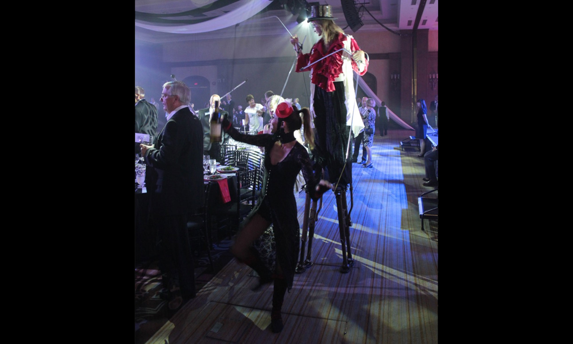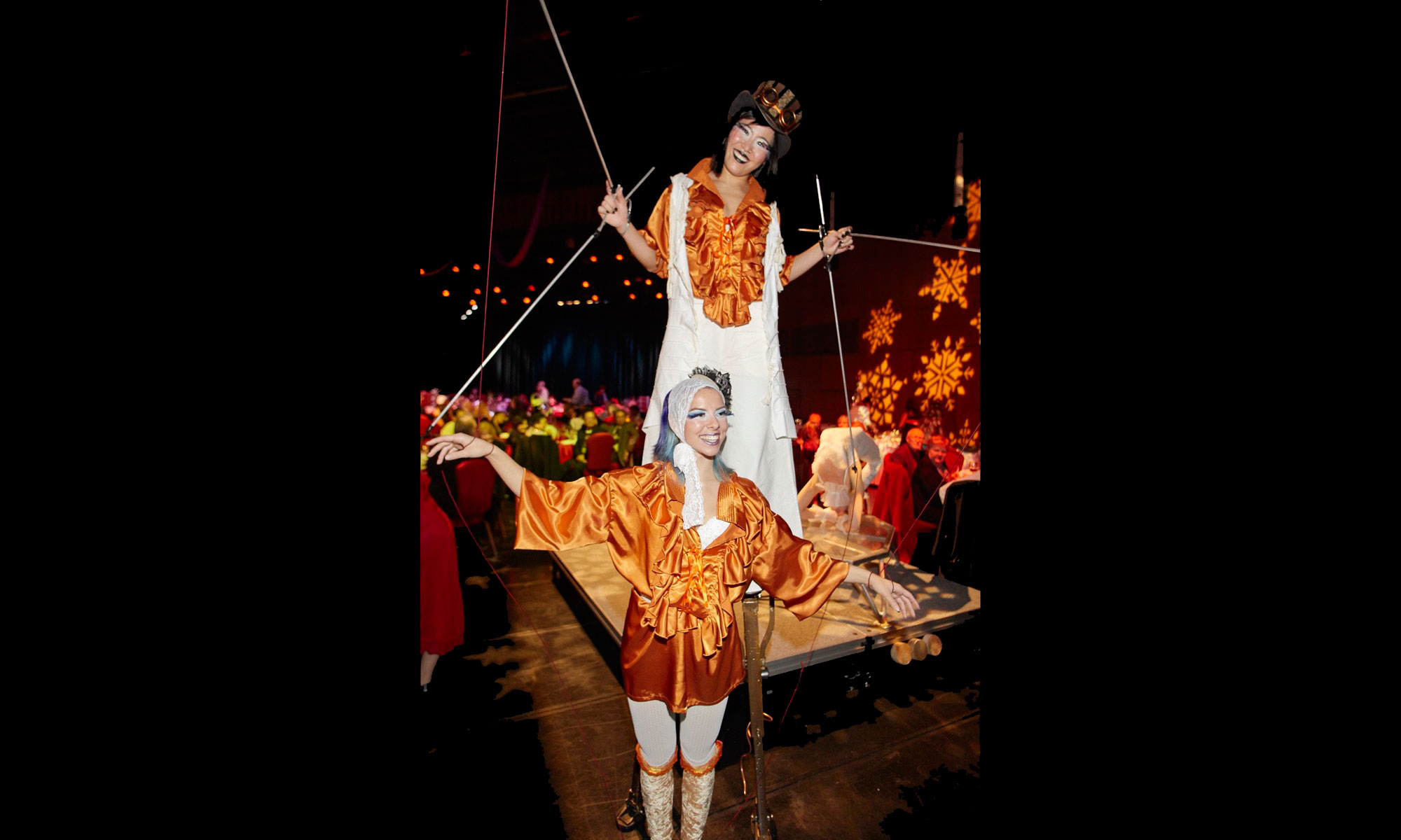 The stilt artist plays the part of a puppeteer controlling their puppet, the contortionist. Together they move around the room, puppeteer pulling the puppet into beautiful yet twisted positions.