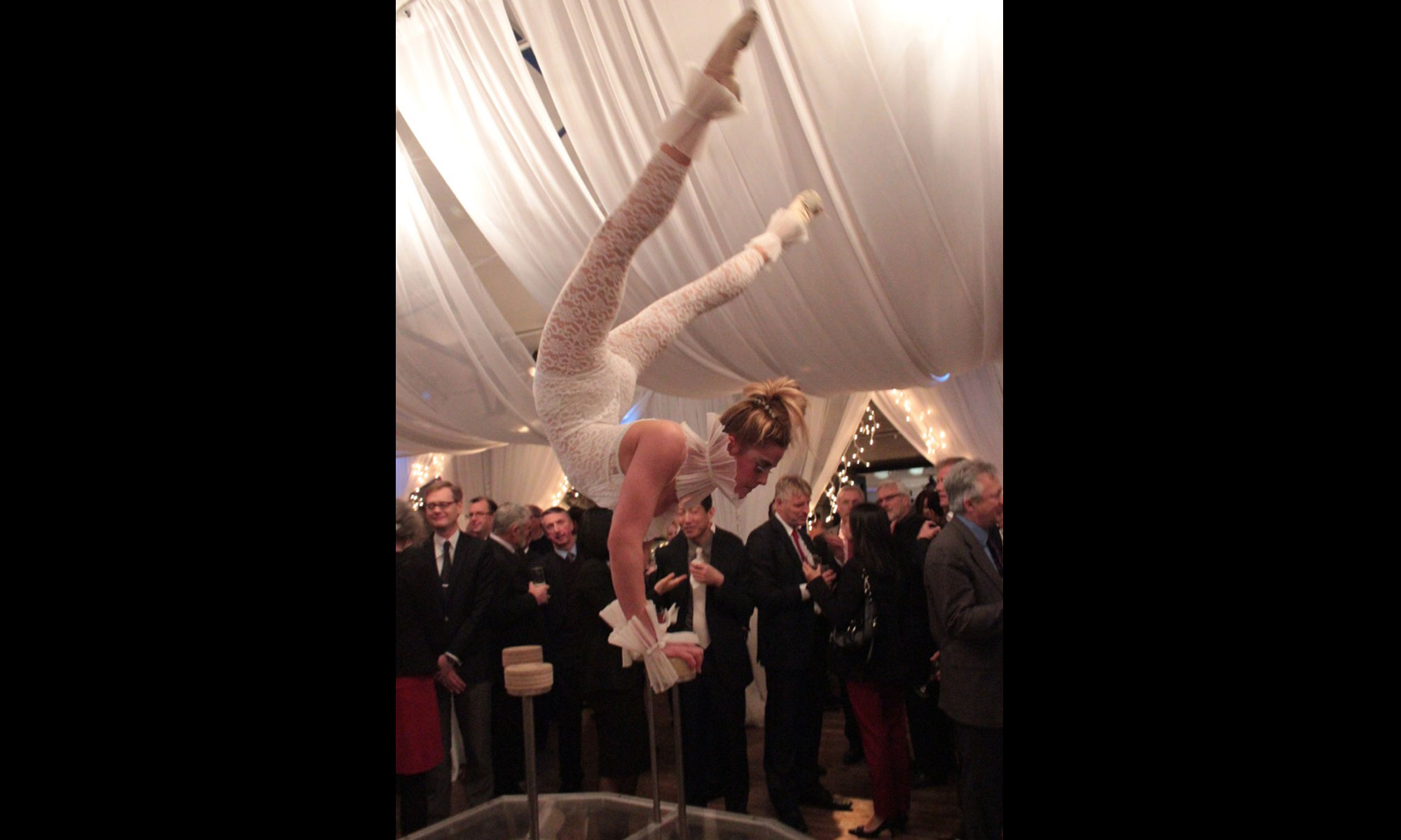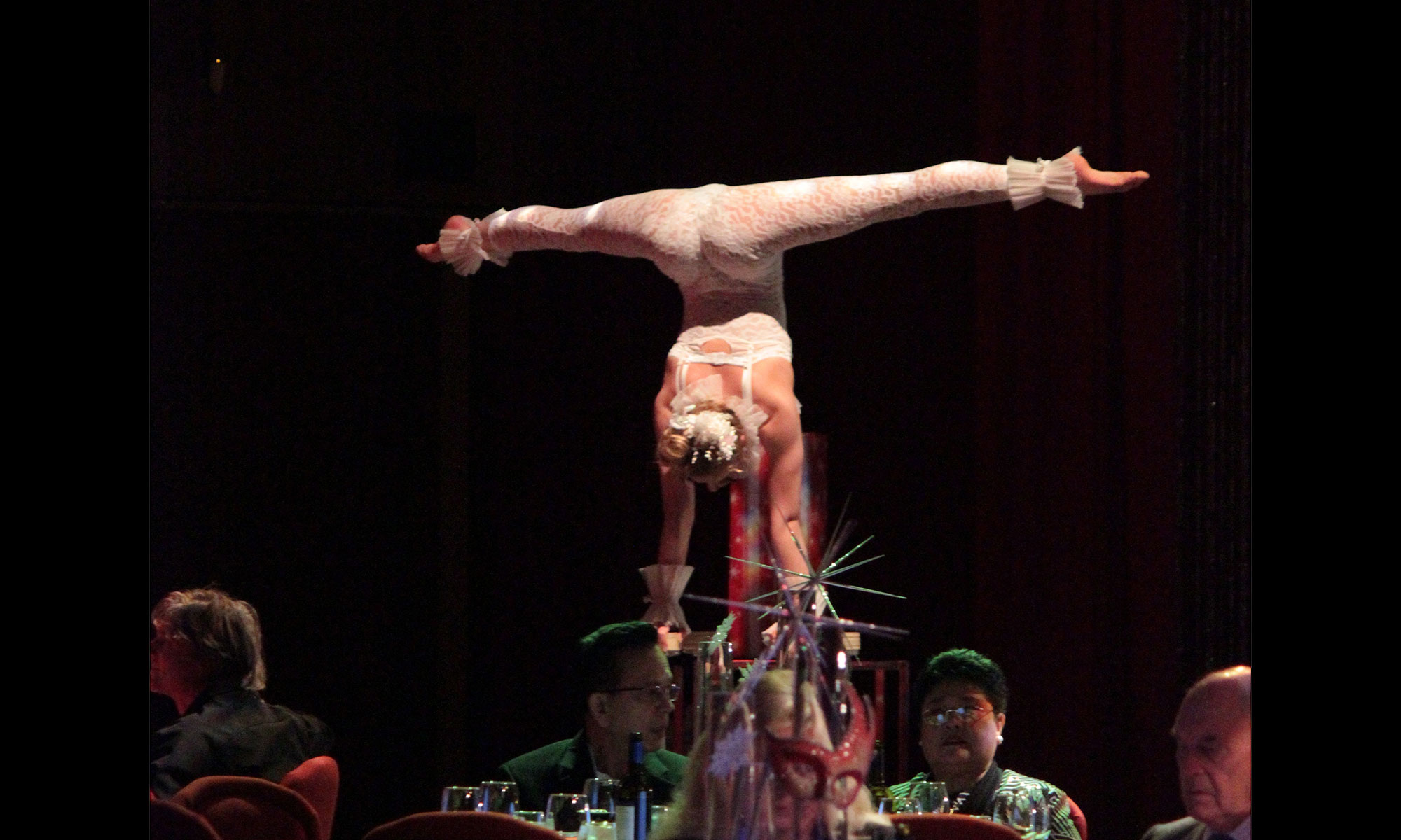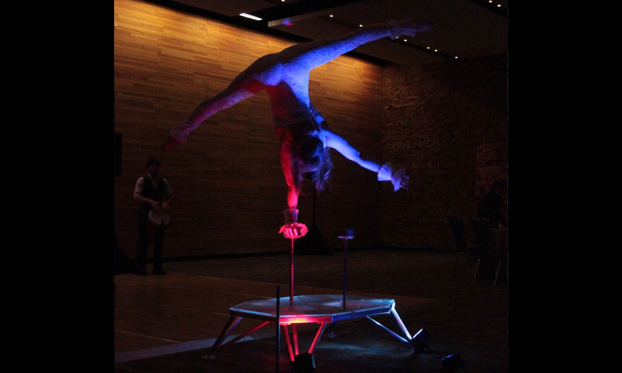 A handstand contortion specialist moves with unerring grace and consumate skill. Strong technique in both handstands and contortion make this twisted balancing act a crowd favourite.
